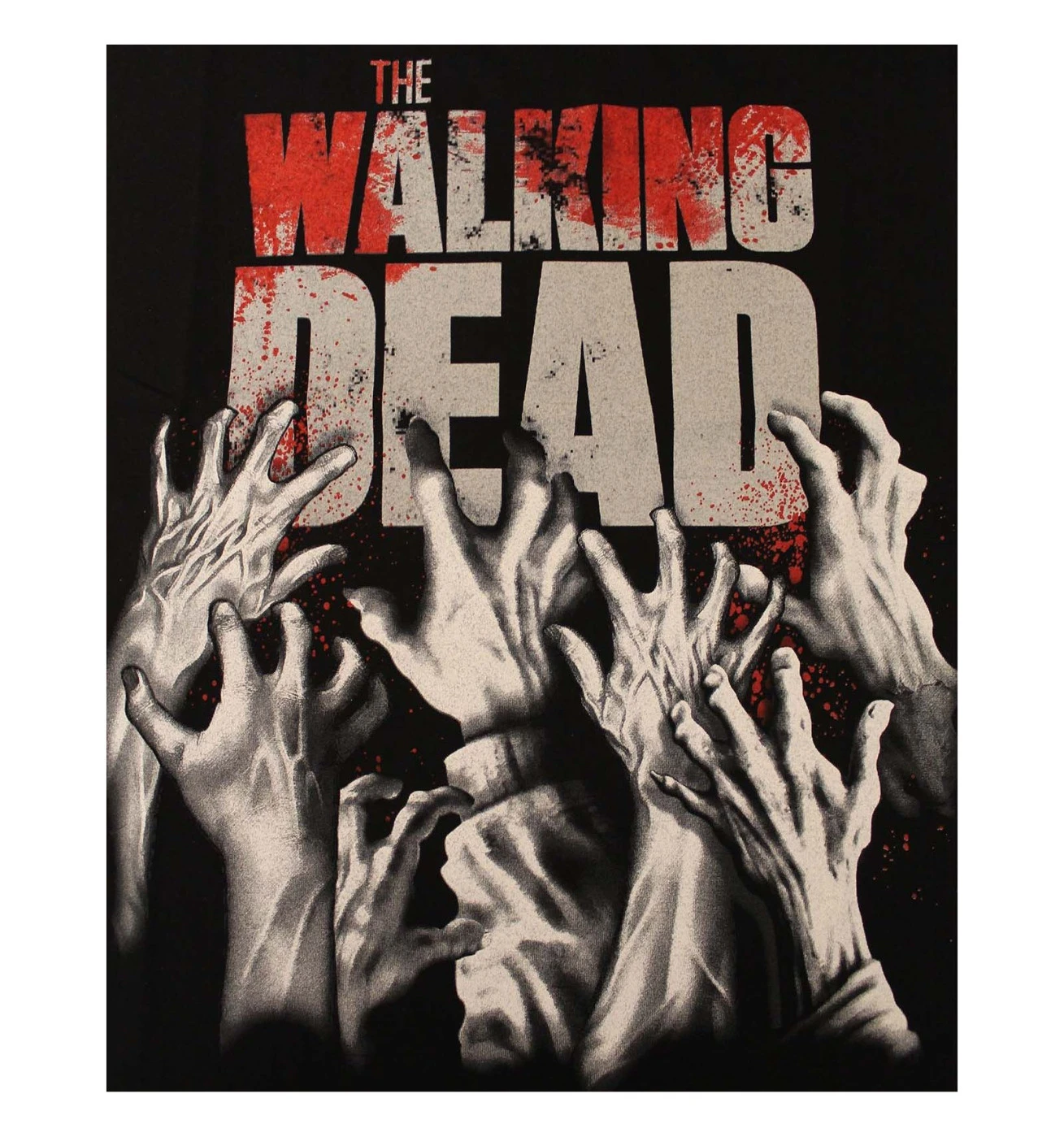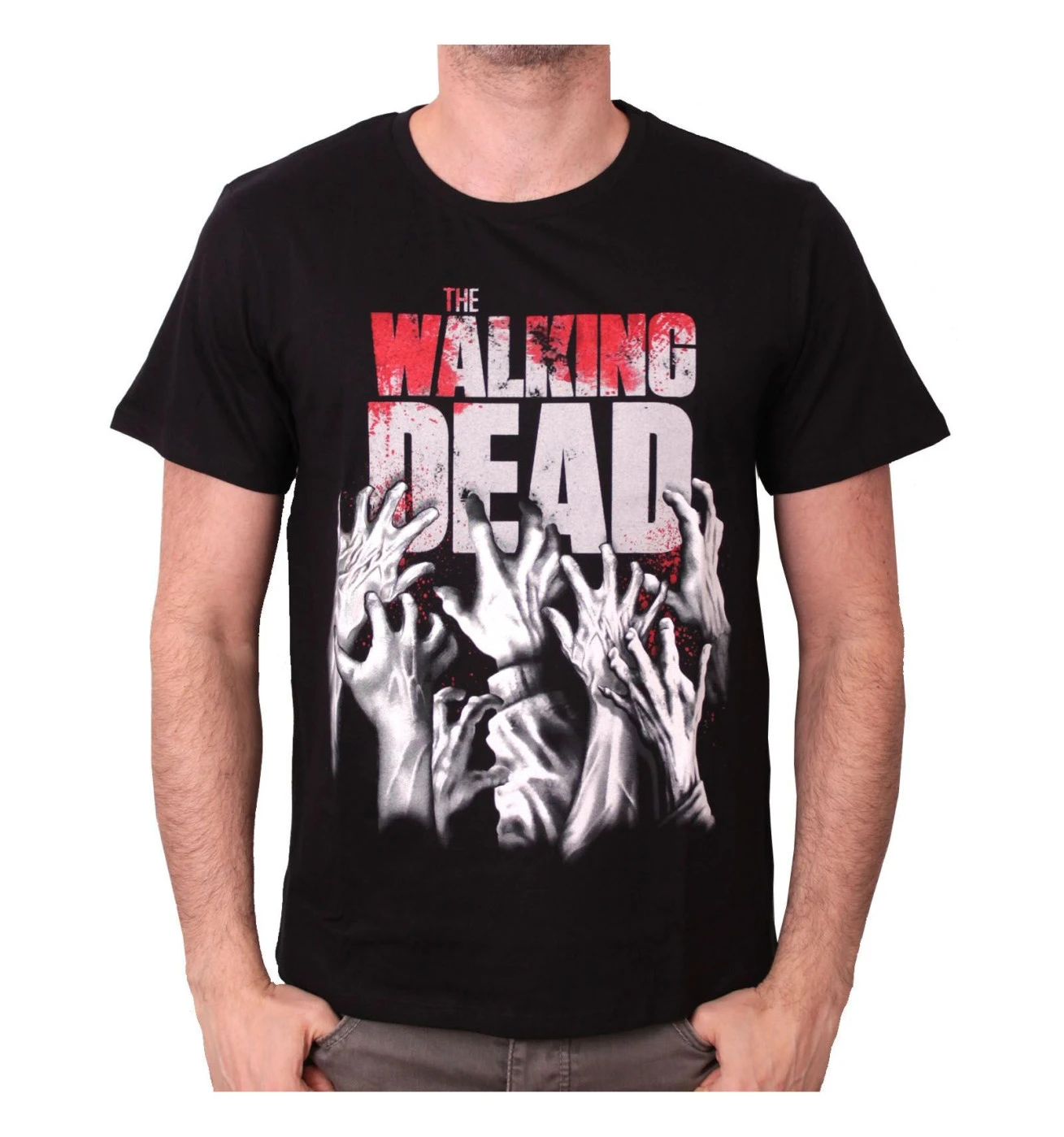 Sur un fond noir, le nom « The Walking Dead » est visible sur le t-shirt et tacheté de sang. Les mains de zombie tentent de s’accrocher au t-shirt. L’esprit apocalyptique et effrayant de la série se retrouve complétement ici. Voici donc un t-shirt qui devrait faire vibrer tous les fans de la série.